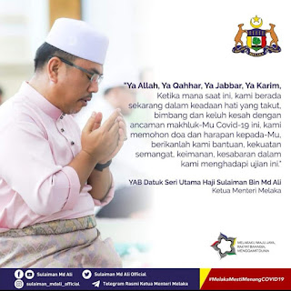 Assalamualaikum. Selamat pagi Orang Melaka. Marilah bersama-sama memohon kepada Allah SWT semoga negeri dan rakyat Melaka terus diberikan bantuan, kekuatan, semangat, keimanan dan kesabaran dalam menghadapi ujian ini. InsyaAllah, Amin. 🤲🏼 #KawalanDiri #MelakaMestiMenangCOVID19 #MelakakuMajuJayaRakyatBahagiaMenggamitDunia